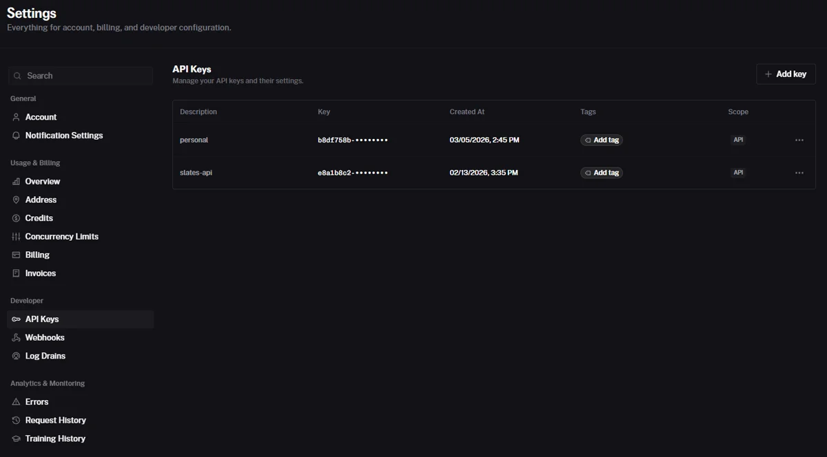 Once you have your keys, paste them into Slates Settings. The whole thing takes about 30 seconds. Every generation from that point forward charges the provider's published rate with zero markup.