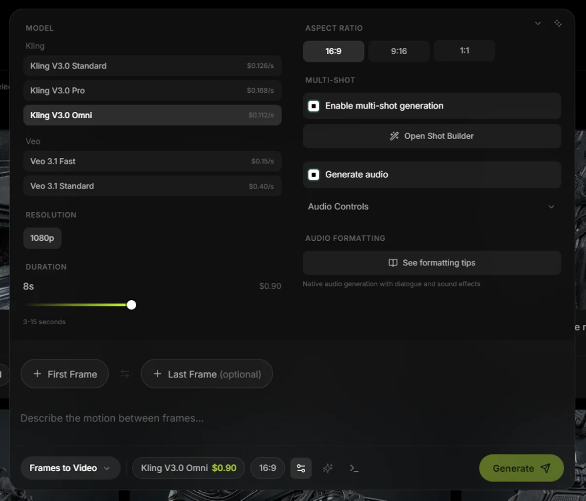 Where Veo falls short: 8-second maximum per generation. No camera controls beyond text descriptions. No multi-shot generation. No Omni-style dialogue mode. And the high end gets expensive. A single 8-second Standard 4K clip with audio costs $4.80.