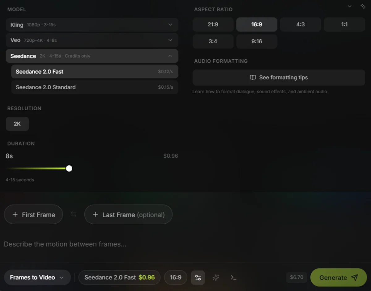 Both Seedance variants are available through Slates Credits. Audio is always included. No extra settings needed. You pick your mode (text-to-video, first/last frame, or omni reference), write your prompt, and hit generate.