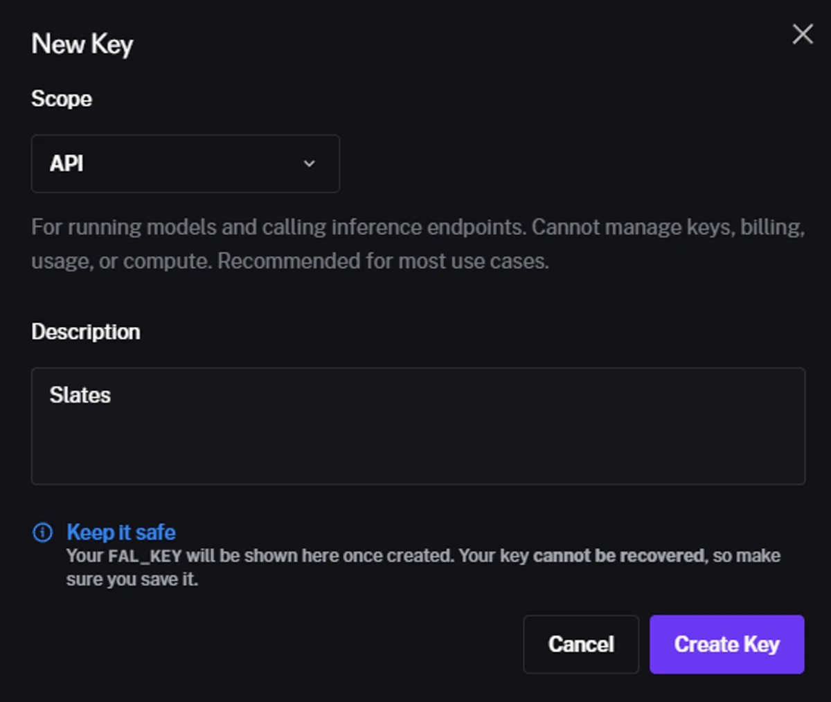 Go to fal.ai, create an account, and generate a key from Settings. Takes about 2 minutes. Free starter credits are included on signup.