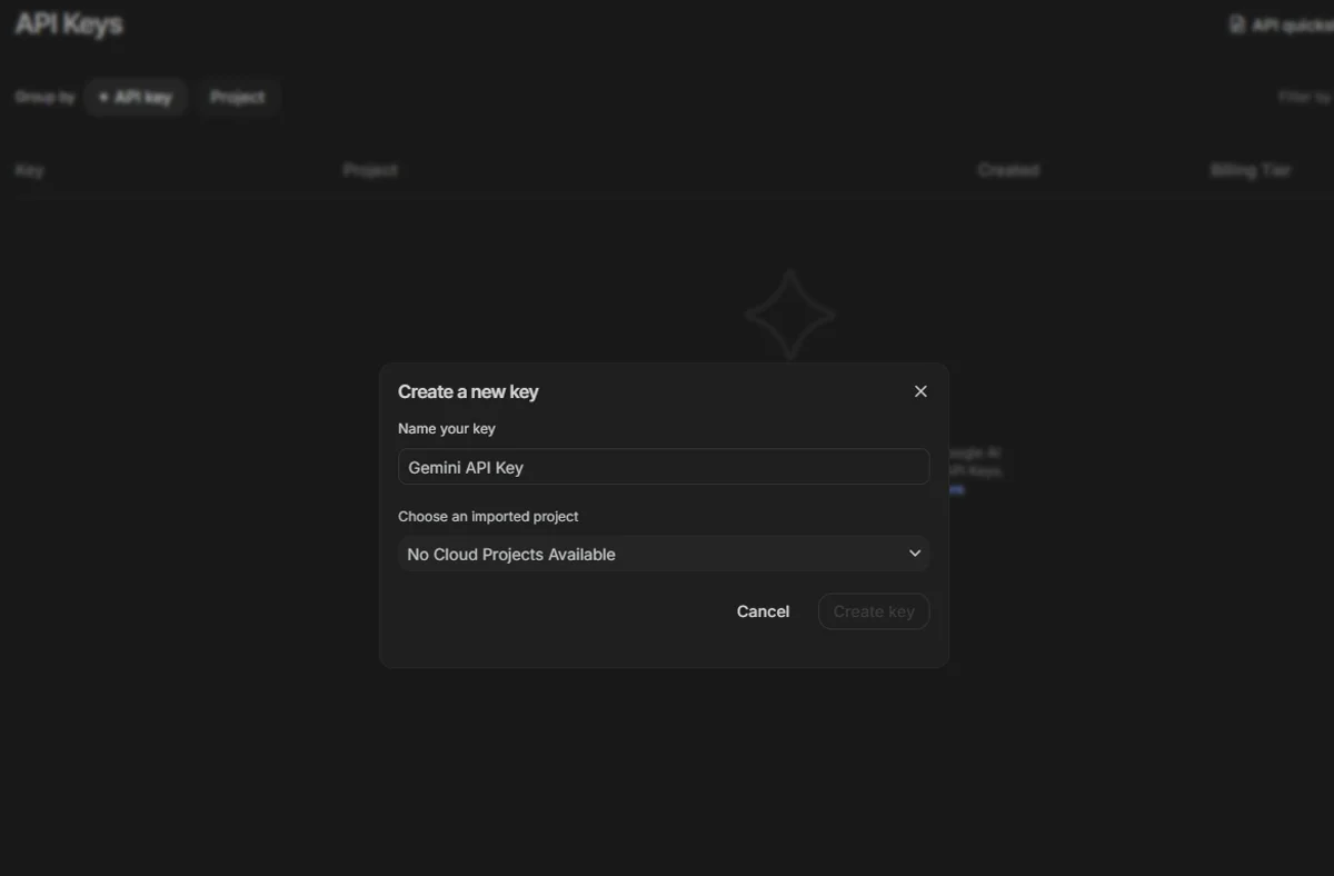 - ›Name your key, select a project (or let it create one for you), and click "Create key"